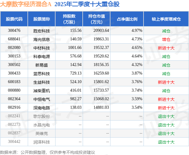 根据2025基金半年报公募基金重仓股数据,重仓该股的公募基金共137家,其中持有数量最多的公募基金为摩根士丹利基金的大摩数字经济混合A。大摩数字经济混合A目前规模为23.86亿元,最新净值2.2928(9月19日),较上一交易日下跌0.22%,近一年上涨145.93%。该公募基金现任基金经理为雷志勇。雷志勇在任的基金产品包括:大摩科技领先混合A,管理时间为2019年4月20日至今,期间收益率为128.52%;大摩万众创新混合A,管理时间为2020年5月7日至今,期间收益率为-0.17%;大摩景气智选混合A,管理时间为2025年5月16日至今,期间收益率为27.45%。
