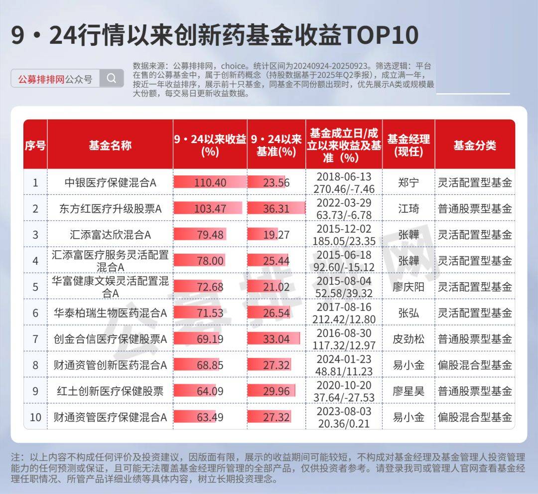创新药基金也表现不俗,其中,中银医疗保健混合A自9·24行情以来收益达110.40%,同期基准为23.56%。(该基金成立于2018年6月13日,成立以来收益为270.46%,同期业绩比较基准为-7.46%)。