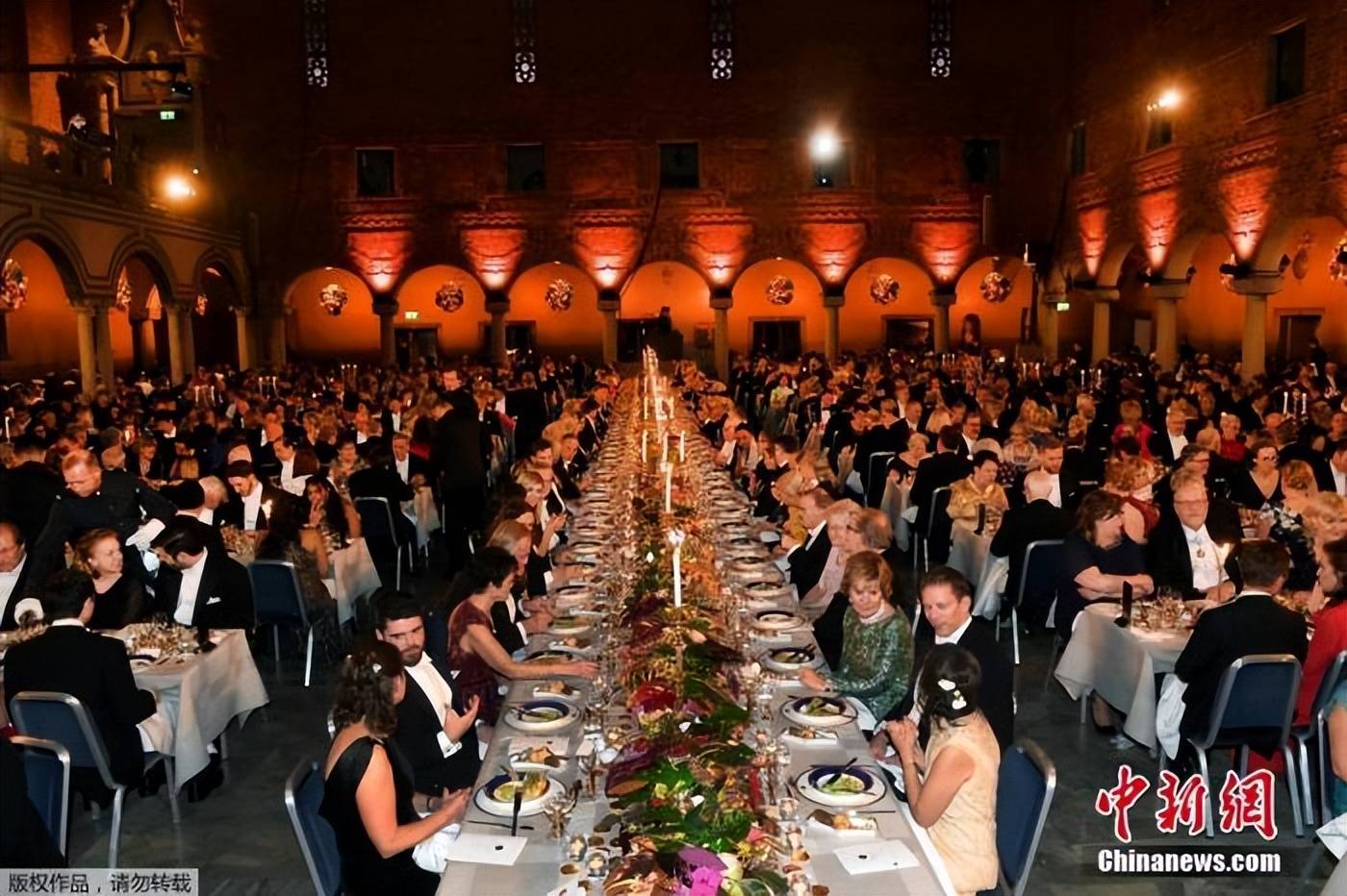 资料图:当地时间2018年12月10日,瑞典斯德哥尔摩,诺贝尔奖晚宴举行,诺贝尔奖得主、瑞典王室成员与众多名流出席。