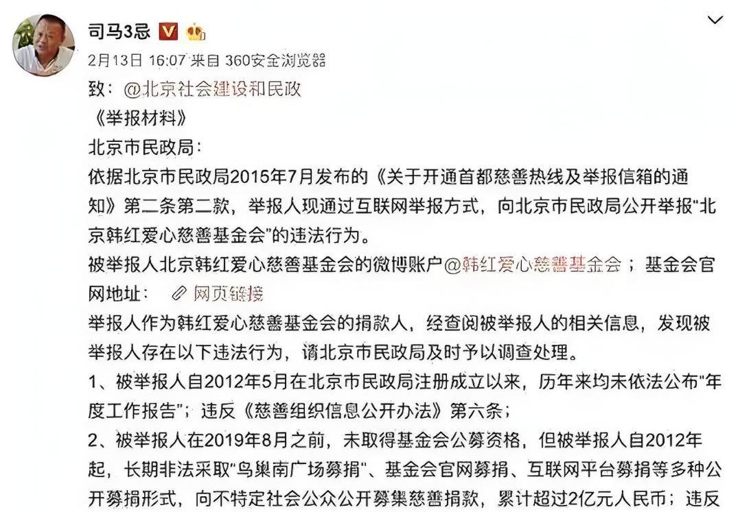 时间轴拉回2020年2月,网络大V司马3忌的一纸举报将韩红爱心慈善基金会推向风口浪尖。举报材料质疑基金会未按规定公示年度报告,上亿善款流向成谜。这场信任危机在民政部门公布审计结果后得以平息——调查证实每笔资金均用于公益事业。但污名化的阴影如同附骨之疽,至今仍萦绕在这位累计捐款超亿元的慈善家身上。