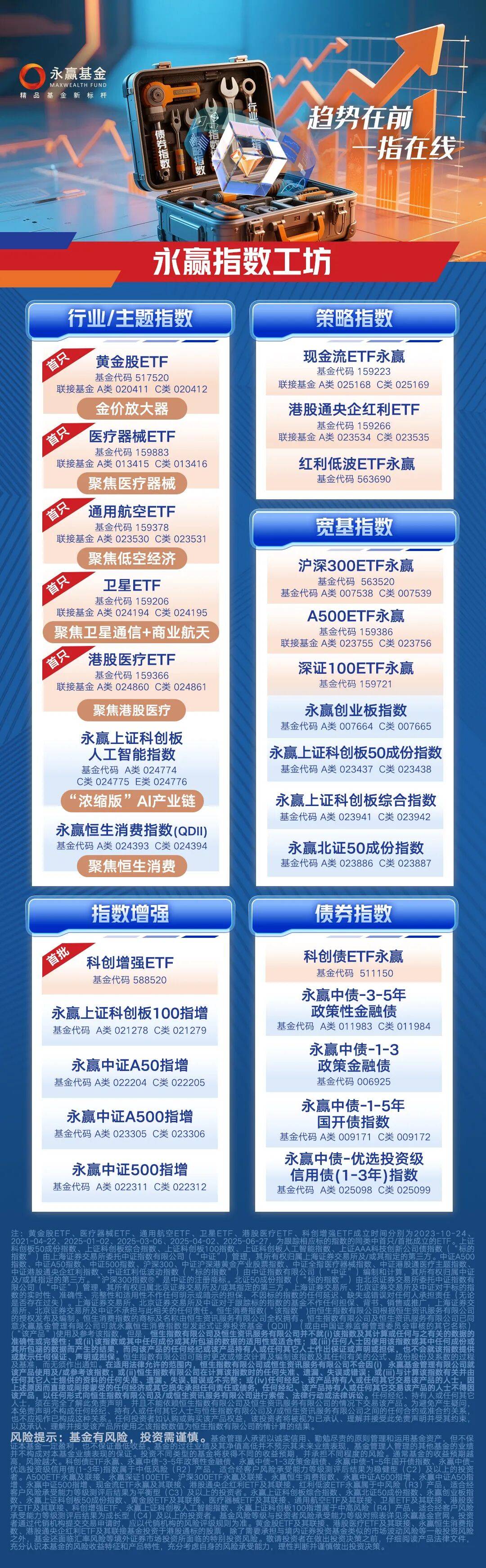 风险提示:基金有风险,投资需谨慎。基金管理人承诺以诚实信用、勤勉尽责的原则管理和运用基金资产,但不保证本基金一定盈利,也不保证最低收益。基金的过往规模、业绩及其净值高低并不预示其未来业绩表现,基金管理人管理的其他基金的业绩并不构成对本基金业绩表现的保证。投资不同类型的基金将获得不同的收益预期,并承担不同程度的风险。通常基金的收益预期越高,风险越大。永赢中证A50指增、永赢中证500指增属于中风险(R3)产品,适合经客户风险承受能力等级测评后结果为平衡型(C3)及以上的投资者。黄金股ETF、通用航空ETF、卫星ETF、永赢上证科创板100指增属于中高风险(R4)产品,适合经客户风险承受能力等级测评后结果为成长型(C4)及以上的投资者。基金风险等级与投资者风险承受能力等级对照表详见永赢基金官网。投资者通过代销机构提交交易申请时,应以代销机构的风险评级规则为准。黄金股ETF、永赢中证A50指数增强、永赢上证科创板100指数增强、永赢中证500指数增强可投资港股通标的股票,除了需要承担与境内证券投资基金类似的市场波动风险等一般投资风险之外,还面临汇率风险等境外证券市场投资所面临的特别投资风险。敬请投资者在做出投资决策之前,仔细阅读产品法律文件,充分认识本基金的风险收益特征和产品特性,充分考虑自身的风险承受能力,理性判断并谨慎做出投资决策。(CIS)返回搜狐,查看更多