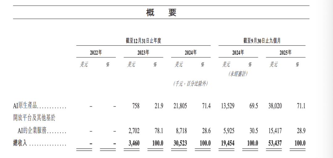 MiniMax 的收入来源主要有两部分,AI 原生产品、开放平台及其他基于 AI 的企业服务,其中 AI 原始产品包括大语言模型、视频生成模型等于 2025 年 6 月底的收入达到 3802 万美元,占比超过 70%,而平台及企业服务部分的收入则为 1541 万美元,占比则为 28.9%。值得一提的是,截至 2025 年 9 月底,AI 原生产品累计用户达 2.12 亿,其中付费用户超过 177.1 万。