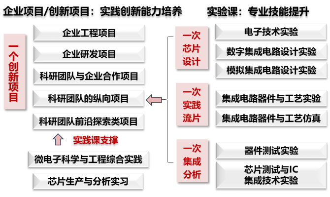 学院打造产教融合、科教融汇的本硕博一体化人才培养模式,本科专业通过“一次芯片设计、一次工艺流片、一次封装测试、一个创新项目”的“四个一”实践化培养,以及校企合作开发的模块化专业选修课程,提升学生工程实践能力。