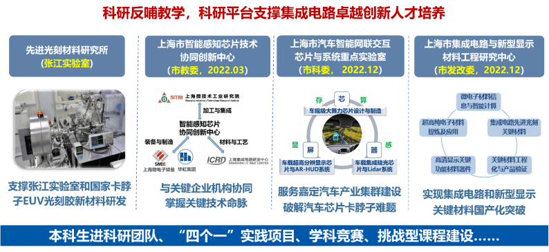 科教融汇:学院与中科院各所合作打造本硕博一体化培养体系。同时学院建有四大科研平台:先进光刻材料研究所、上海市智能感知芯片技术协同创新中心,上海市汽车智能网联交互芯片与系统重点实验室,上海市集成电路与新型显示材料工程研究中心。为学生提供充足的参与前沿科学研究与实践的机会。