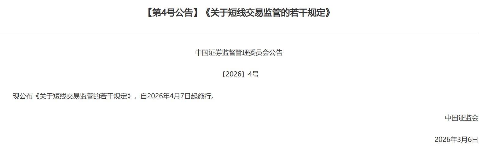2026-03-10米兰体育,米兰体育官方网站,米兰体育APP下载3月6日晚间,证监会在官网发布《关于短线交易监管的若干规定》(以下简称《若干规定》),自2026年4月7日起施行。