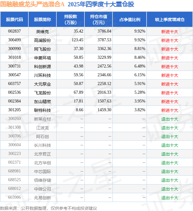 根据2025基金年报公募基金重仓股数据,重仓该股的公募基金共2家,其中持有数量最多的公募基金为国融基金的国融融盛龙头严选混合A。国融融盛龙头严选混合A目前规模为0.84亿元,最新净值1.5523(3月10日),较上一交易日上涨2.55%,近一年下跌28.47%。该公募基金现任基金经理为周德生。周德生在任的基金产品包括:国融融银灵活配置混合A,管理时间为2023年2月7日至今,期间收益率为-41.4%;