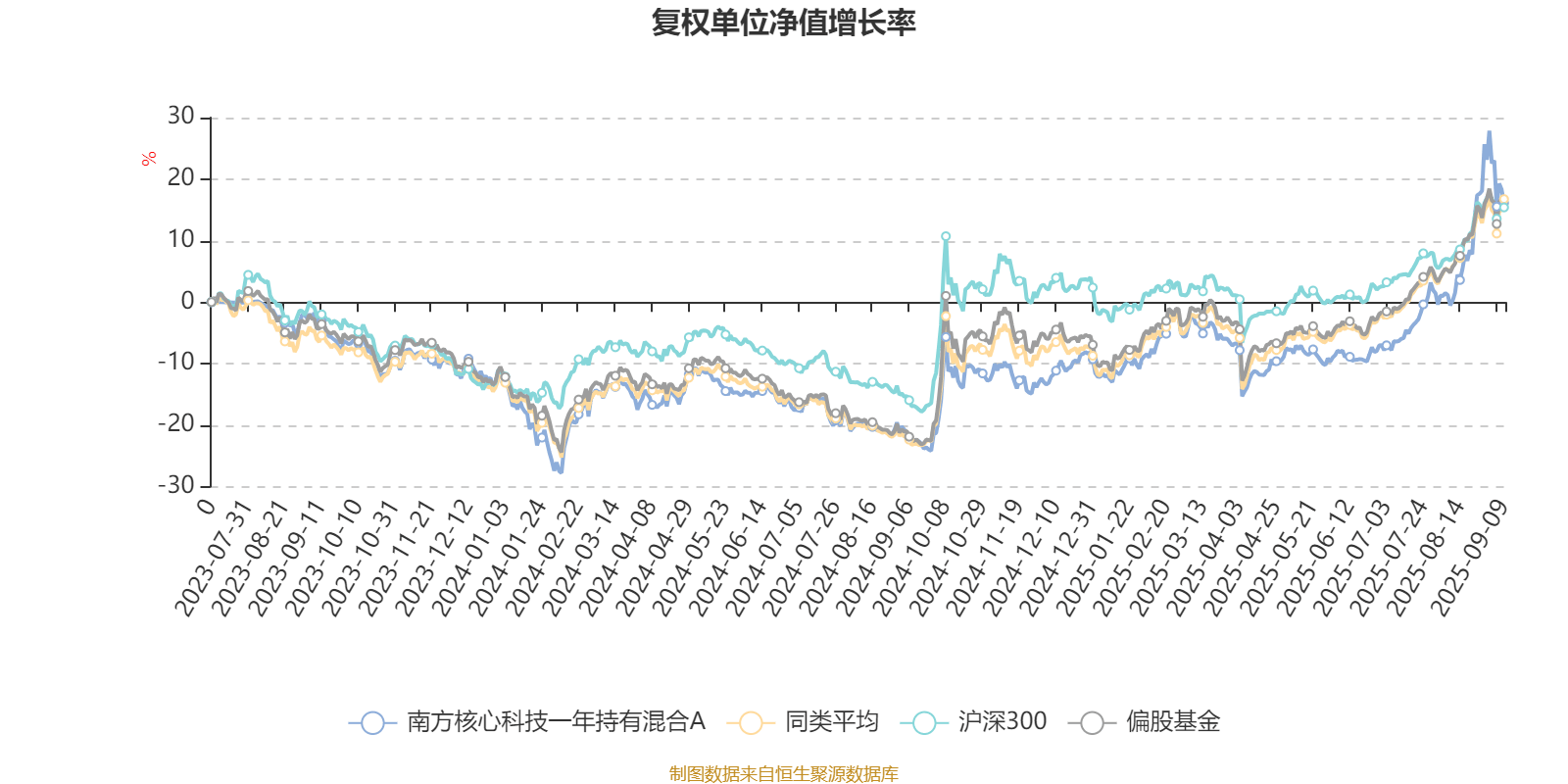 截至9月9日,南方核心科技一年持有混合A近三个月复权单位净值增长率为26.07%,位于同类可比基金148/615;近半年复权单位净值增长率为19.01%,位于同类可比基金227/615;近一年复权单位净值增长率为50.16%,位于同类可比基金249/602。