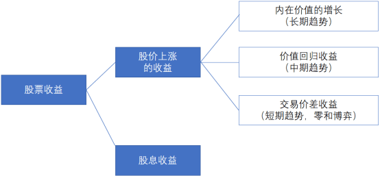 从收益来源来看,股票投资收益可分为四大类,不同收益对应不同的时间维度与逻辑。